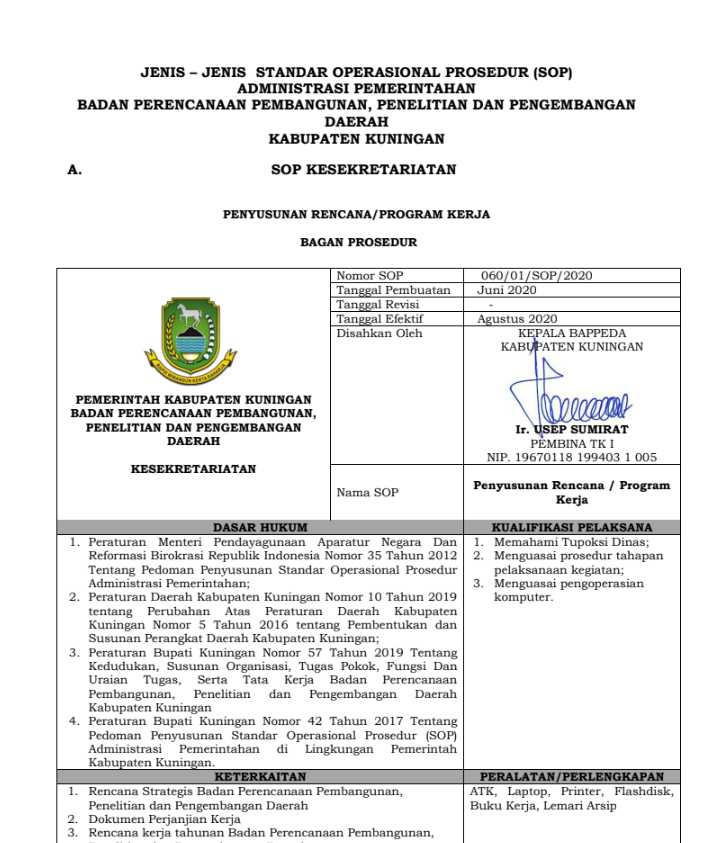 Berikut merupakan tautan untuk mengunduh SOP Bappeda Kabupaten Kuningan: SOP Bappeda Kabupaten Kuningan.